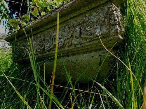 - close up of concrete stone planter with carvings of frogs, birds, and leaves. in the top strawberry plant leraves can be seen and in front long grass