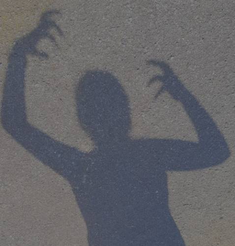 - dark grey shadow on grey tarmac holding hands above head with fingers held in clawed shape