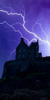 - purple night sky with lightening cracking over manor houses on a cliff surrounded by stone walls. Cropped photo of a side view of Edinburgh castle