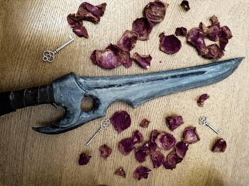 - wooden table with dried rose petals and decorative keys scattered around a dagger with brown leather wrapped handle and extended blade over finger guard. whole picture is shaded to be darker to emulate evening lighting