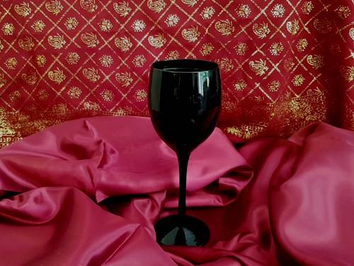 - black wineglass full of dark red liquid on draped red satin with a red and gold fabric background (easter egg note, the drink was dr pepper and raspberry sports drink and tasted vile)