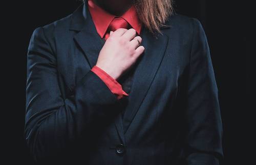 - person wearing black suit and red shirt adjusting red tie. photo cuts off above the neck and below the waist