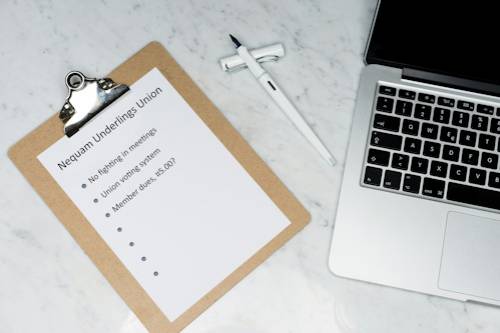 - desk with clipboard, smart pen, and laptop. clipboard reads "nequam underlings union. no fighting in meetings, union voting system, member dues 5?