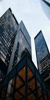 - low angled shot of several black glossy skyscrapers with yellow lights coming through some of the glass windows. shortest building at the front has yellow square light panels. grey sky