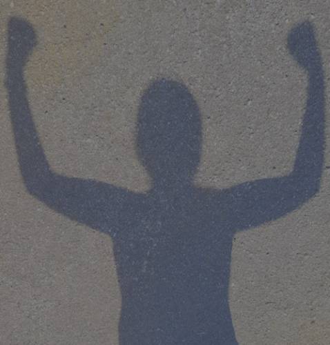 - dark grey shadow on grey tarmac holding hands above head with balled fist in a muscle pose style