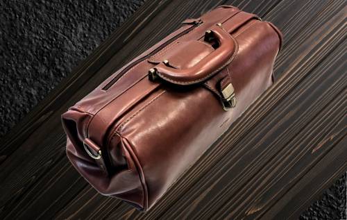 - closed chocolate leather doctors briefcase with brass metalwork on wooden table and black plaster wall background