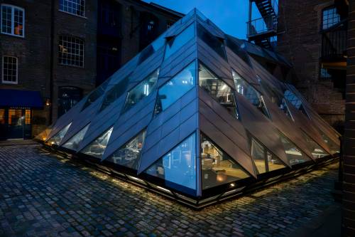 - pyramid made of solar panels and glass in a diamond pattern on brick road surrounded by brick factories. night time. inside the glass portions a typical office set up and many cardboard boxes